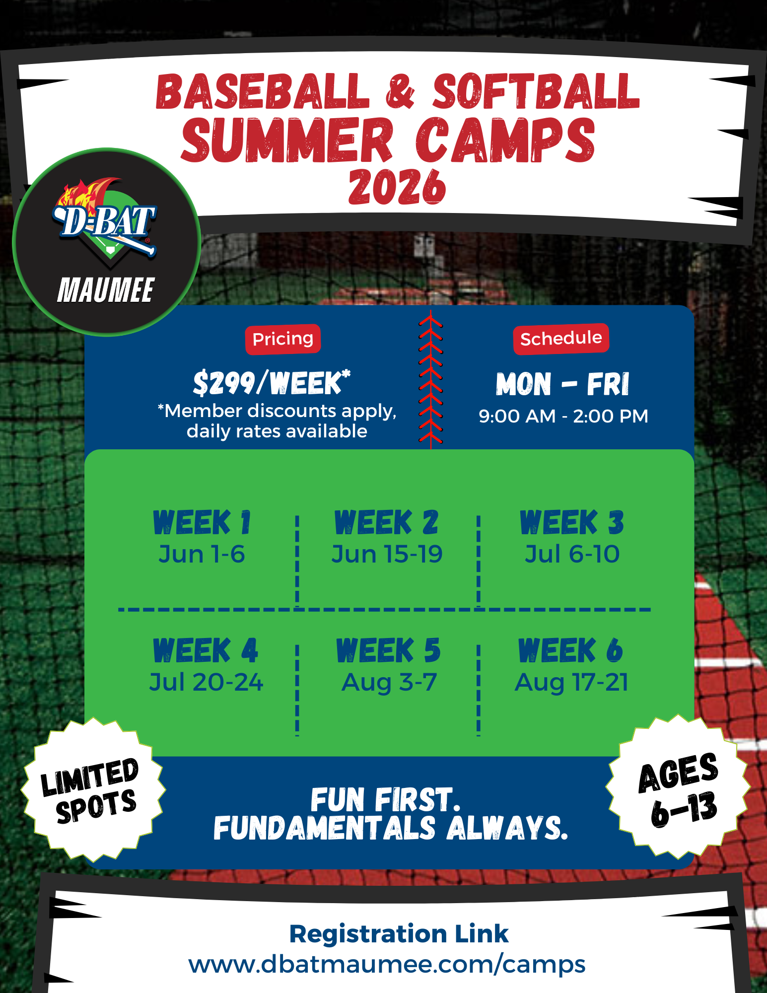 At D-BAT we host more than 50 Camps, Clinics & Classes each year providing a great opportunity for players to improve while having fun at the same time! Our Spring/Holiday Break and Summer Camps are very popular with parents who are looking for something constructive to keep their ballplayers busy when school is out. Our specialty clinics — typically focused on one aspect of the game — give athletes a chance to fine-tune established skills or work on problem areas. For the latest information on our camps and clinics see our camp fliers below.